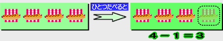 【 ホットドッグが 4こ あります。1こ たべました。のこりは なんこ ですか? 】 |